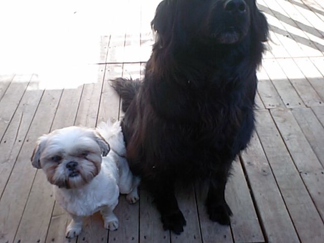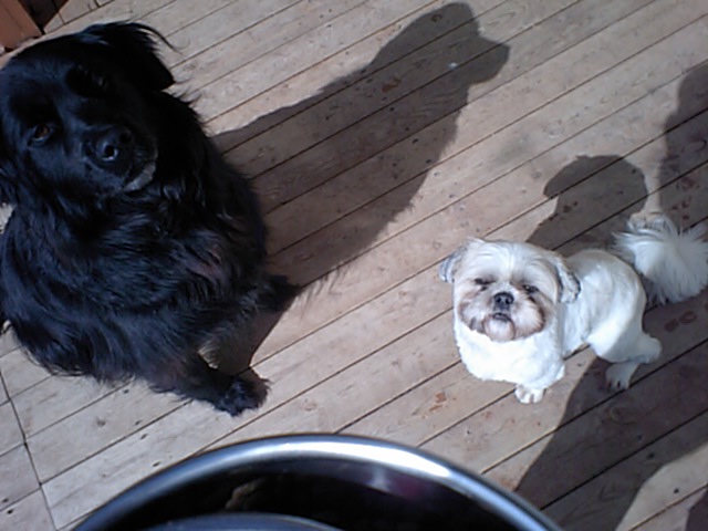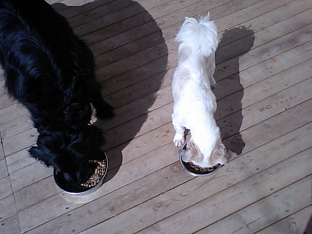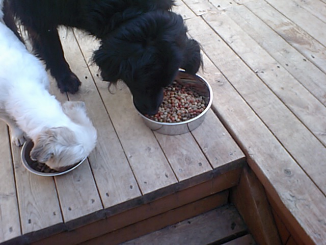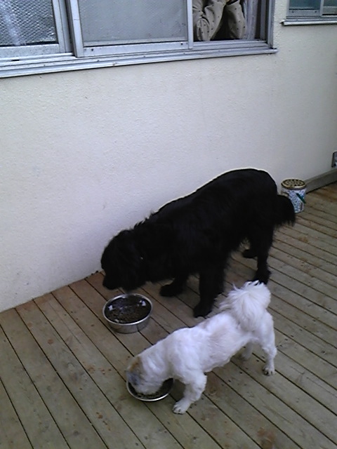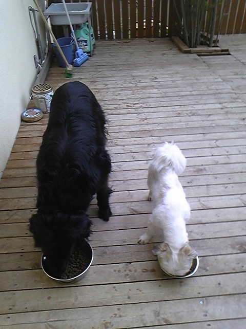 ボーダーのサエノスケ君とシーズーのラッキー君、仲良く完食しました。