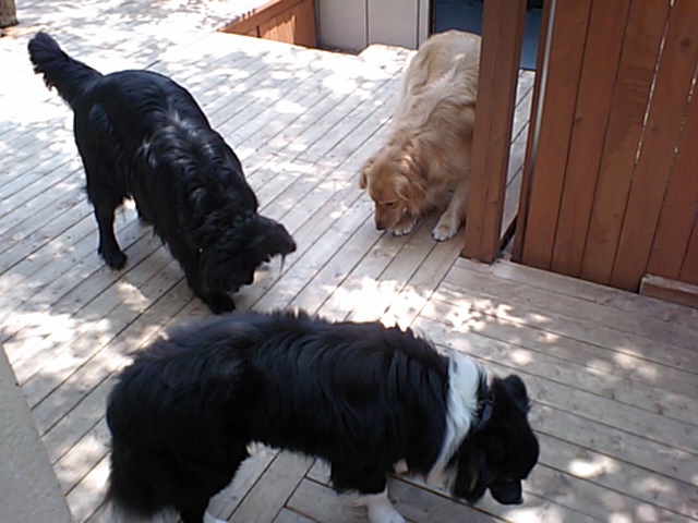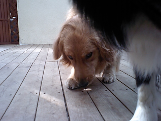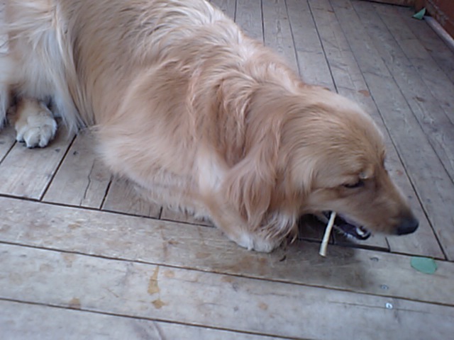 ゴールデンのそらちゃん、すっかりダディーに馴れた様子です。今はみんなと骨ガムを食べてます。