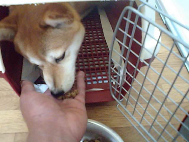 豆柴の小春ちゃんは夕べのご飯は完食してました。飼い主さんから離れて心細いのか、ハウスから出てこない小春ちゃん、店長の手から食べてます。