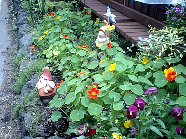 芝桜の花は終わり、パンジーやビオラ達はまだ花を咲かせてます。ナスタチュームはどんどん茎を伸ばし、次々に花を咲かせてます。