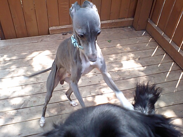 ミッキー君はワンコ大好き、フラット大治郎にまとわりついてご機嫌です。