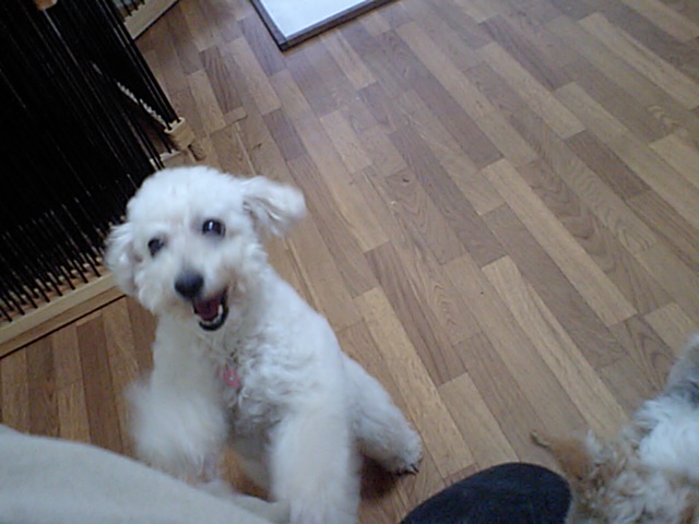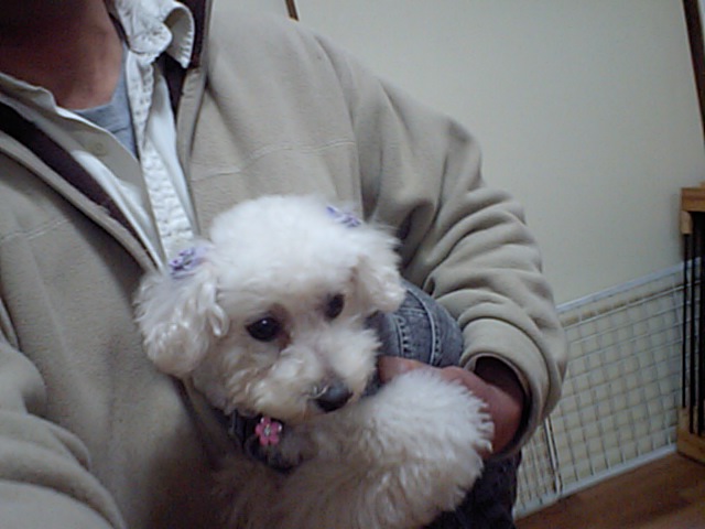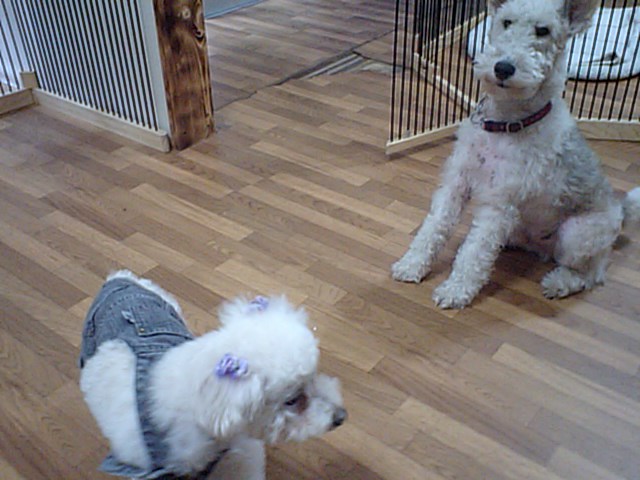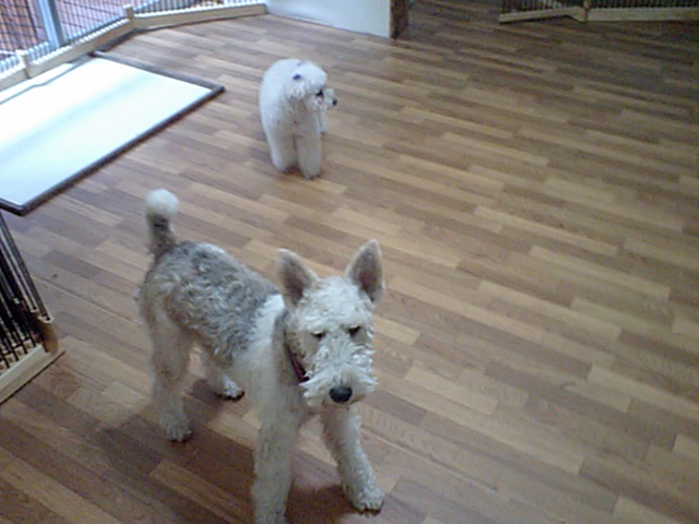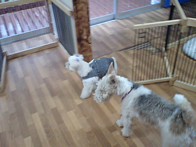 トイ・プードルのぴーなつちゃんがチェックインしました。 少しもじっとしてくれないので、抱っこをして記念撮影です。って言うか、すぐに抱っこをせがんで飛びついて来ます。 アクティブなワイヤーのロビン君は苦手かな?って思いましたが、意外と仲良くやってます。