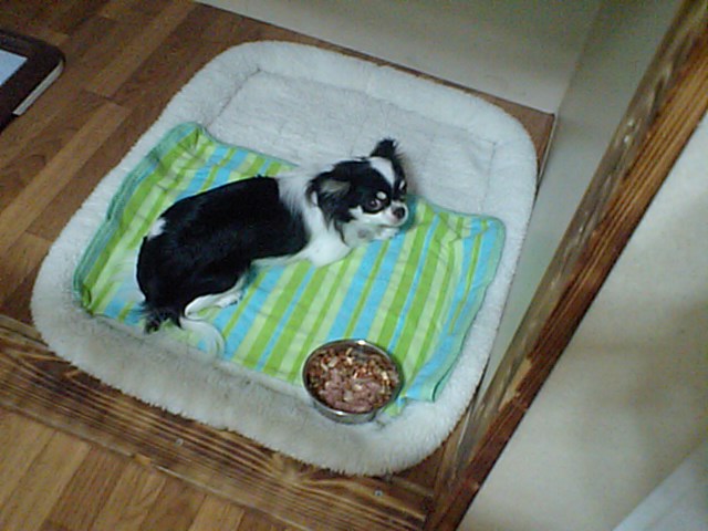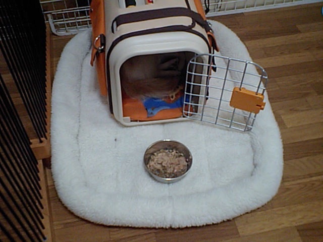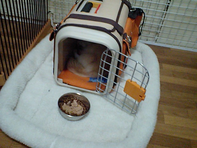 ダックスのチャッピー君はキャリーバッグに籠もってしまいました。ご飯は置いておきます。