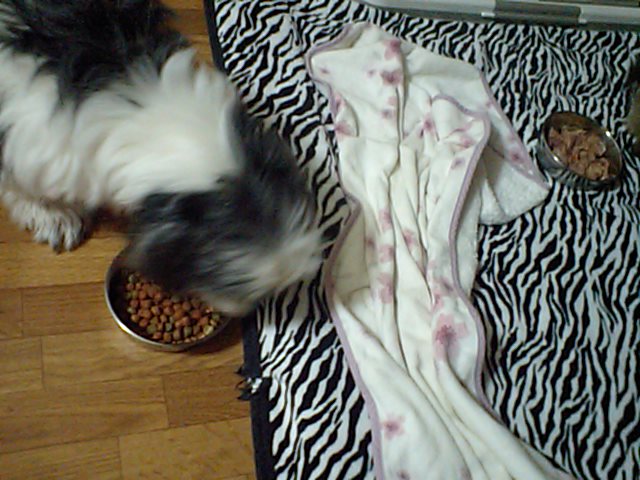ヨーキーのだいご君、朝には夕べのご飯が無くなってました。 ただ、キャリーバッグから出てきません。