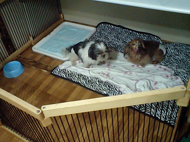 老犬のぺぺちゃんとショコラちゃんは大人しく寝ています。時々ぺぺちゃんが立ち上がり、向きを変えたりしています。 ミックスのリアンちゃんとトイプーのマリーちゃんは仲良く遊んでます。結構良いコンビですね。