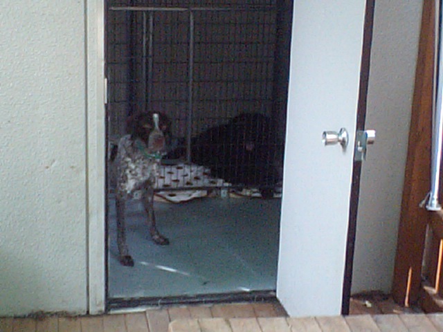 ジャーマン・ポインターのモス君は暑いらしく、犬舎の中から出て来ません。中の方がヒンヤリ涼しいのかな?