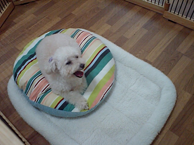 前回は日帰りだったのですが、今回はお泊まりです。前回はしばらく寂しがってましたが、今回はすぐに自分のクッションの上で寛いでます。