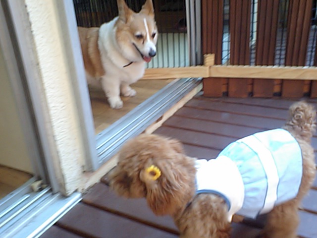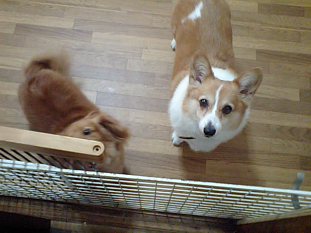 コーギーのハナちゃんとダックスのメロンちゃん、ご飯に口を付けません。店長部屋の側で座ってます。