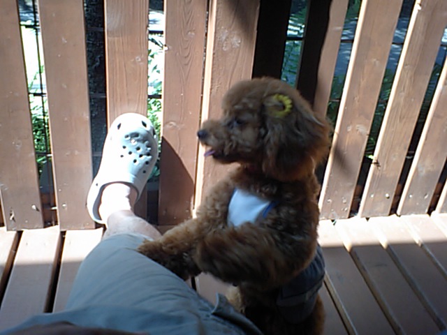 トイプーのゆきちゃんがチェックインしました。飼い主さんが居なくなってしばらく走り回ってましたが、やっと店長の膝の上に落ち着きました。