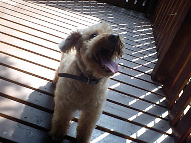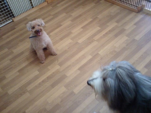 トイプーのシェリー君はサークルから出て、デッキや店内で寛いでます。ビアテッドのトビー君とは微妙な距離感、仲良くする訳でも無くお互いに干渉し合わないって感じです。