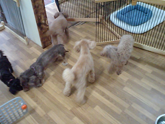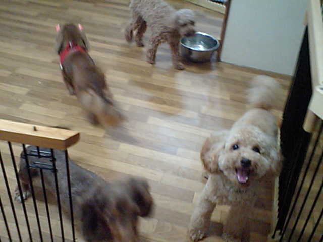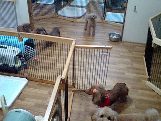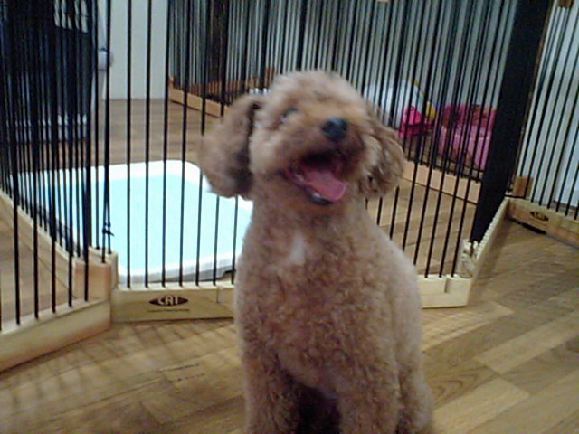 トイプーのハリー君がチェックインしました。最初は寂しがって鳴いていましたが、5分程で落ち着きました。他のワンコとも仲良くなってますよ。お母さん、ご心配なく。