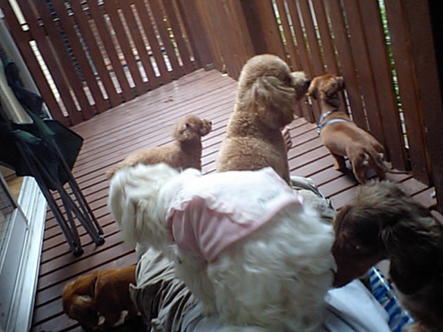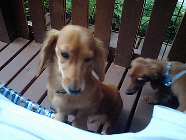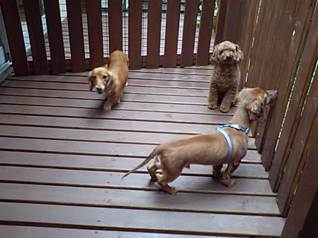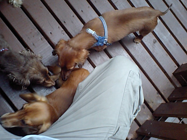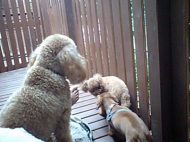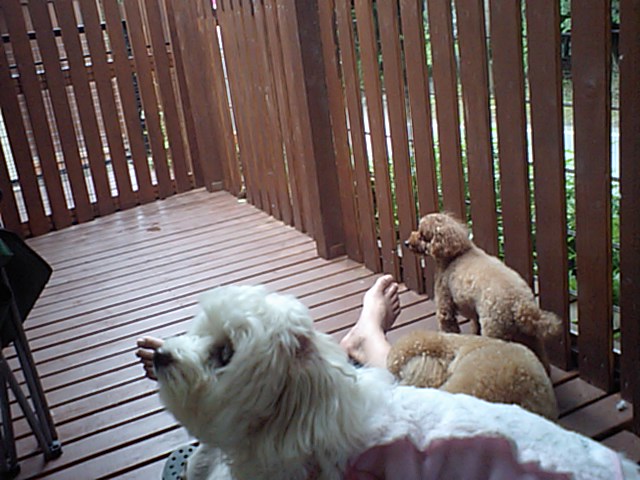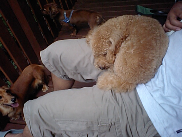 デッキでのんびりの店長のお腹の上に、リアン君やメイちゃんが乗って来ます。 他にもダックスリアンちゃんが乗ろうとしたり、周りに集まって来てます。