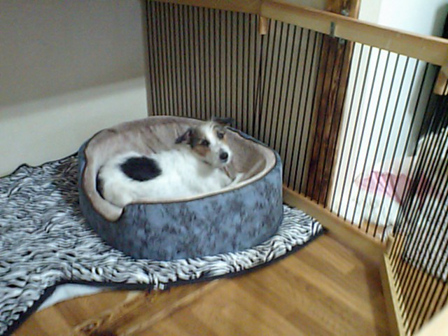 みんなサークルから出て遊んでます。みんな仲良くしてますからね。ジャック・ラッセルのろくた君は自分のベッドで寝ています。