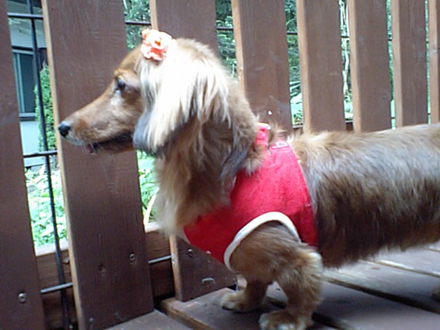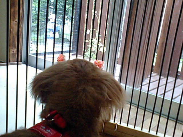 ダックスのさくらちゃんがチェックインしました。飼い主さんと離れるのが寂しいさくらちゃん、外にいるお婆ちゃんを眺めて居ます。
