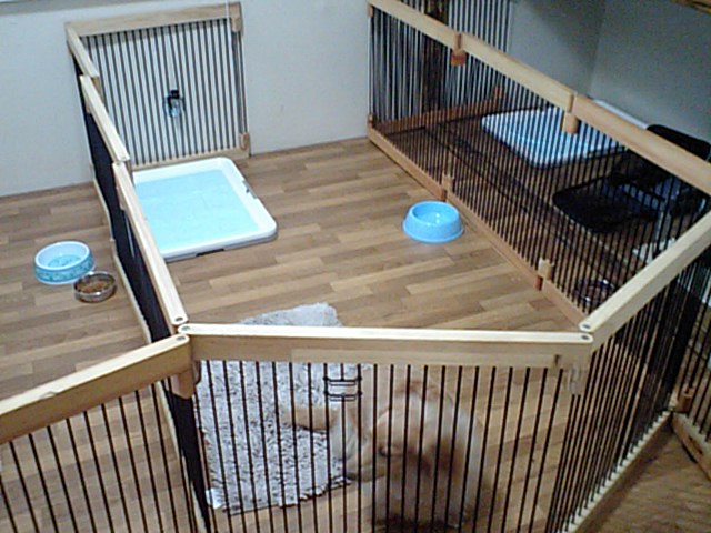 他のワンコは苦手?とりあえずサークルに居てもらいますね。