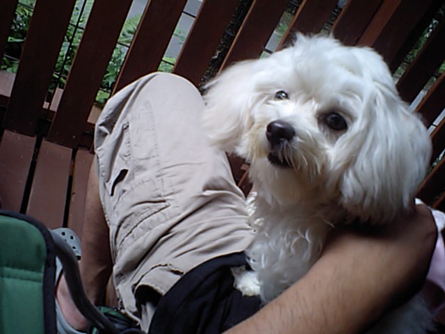 ミックスのメイちゃんはワンコ達が怖いみたい。店長に抱っこが定位置になってます。