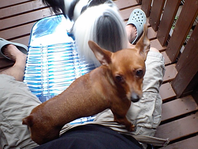 ミニピンのジャム君とパピヨンのカノン君、店長にべったりしてます。