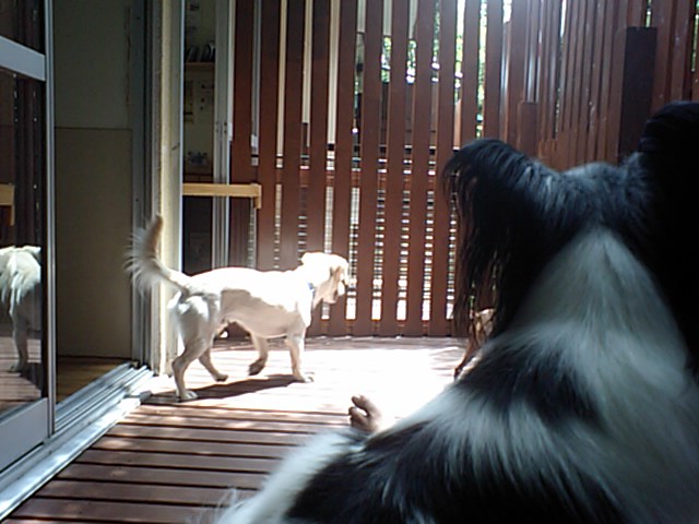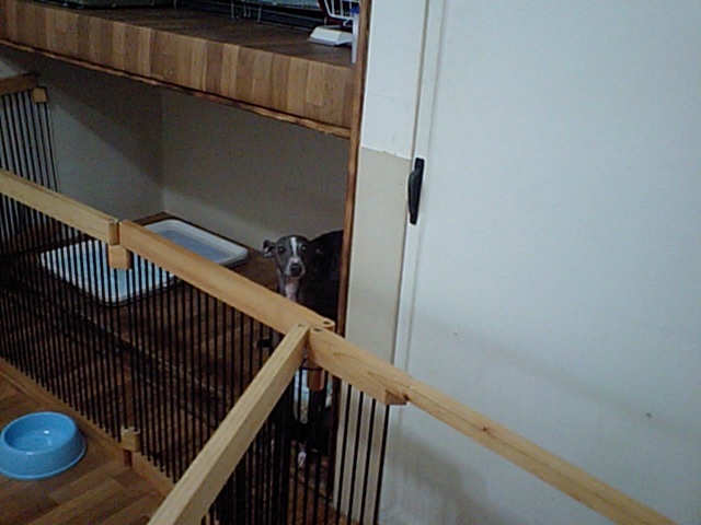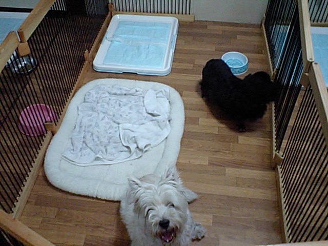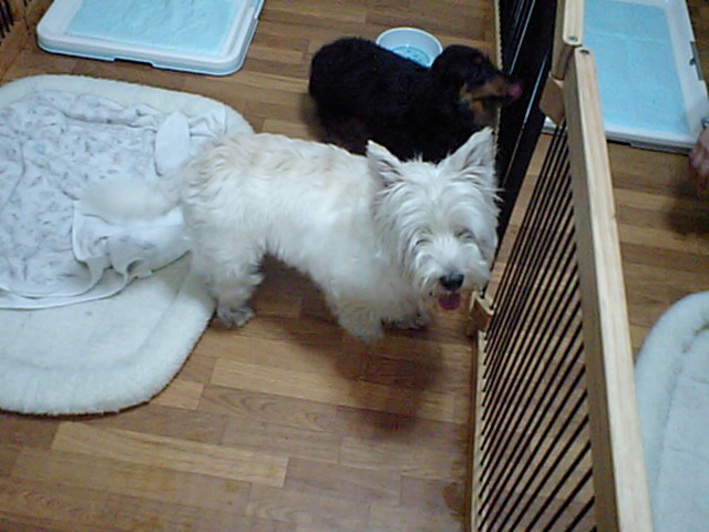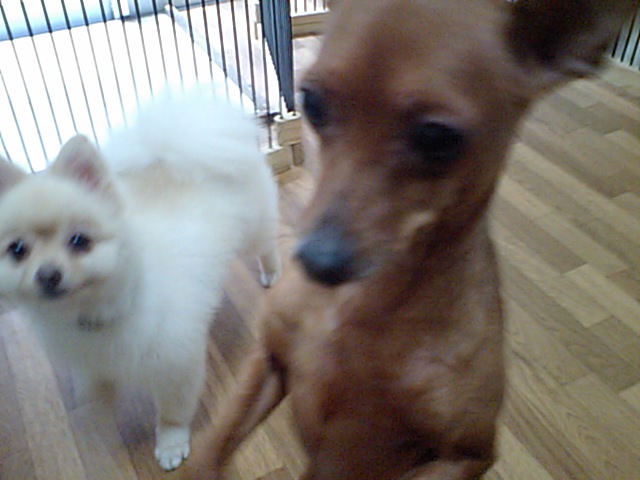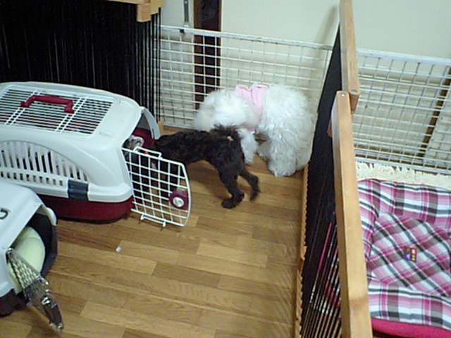 トイプーちゃんズは、アクティブなミニピン君とトイプーマリに追いかけられ、サークルの中に避難してます。