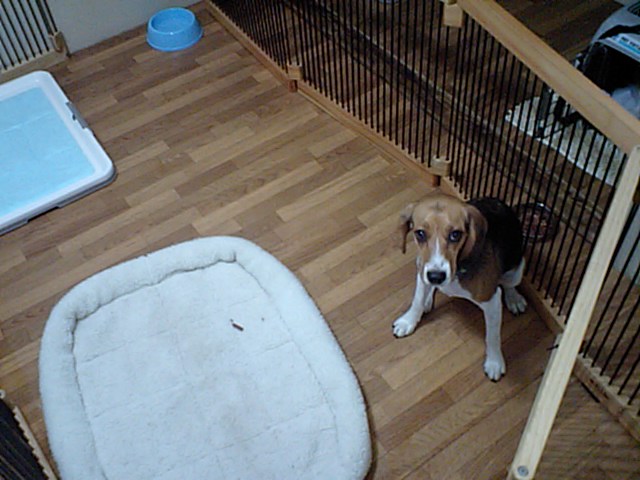 ビーグルのマルコちゃんがチェックインしました。マルコちゃんも少し他のワンコに緊張している様子、バリケンをサークルに入れてあげますかね。