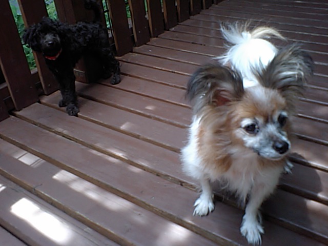 パピヨンのエル君と、ジャックラッセルのマイロ君はデッキでのんびりしてます。マイロ君は店長の座っている椅子の下です。