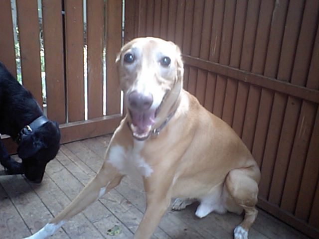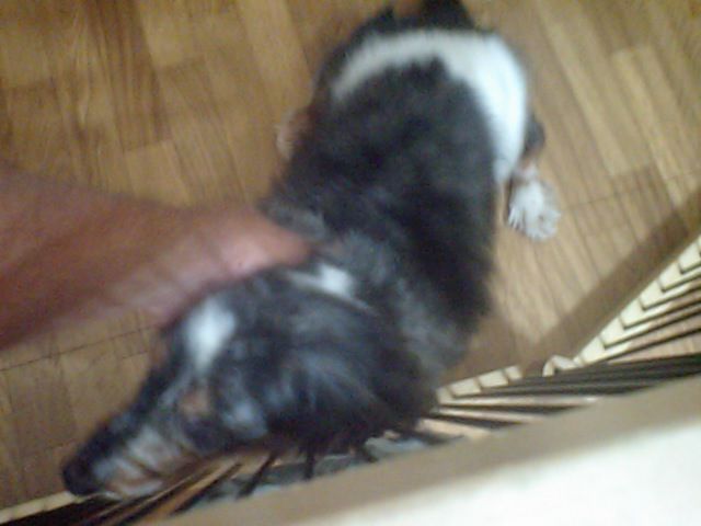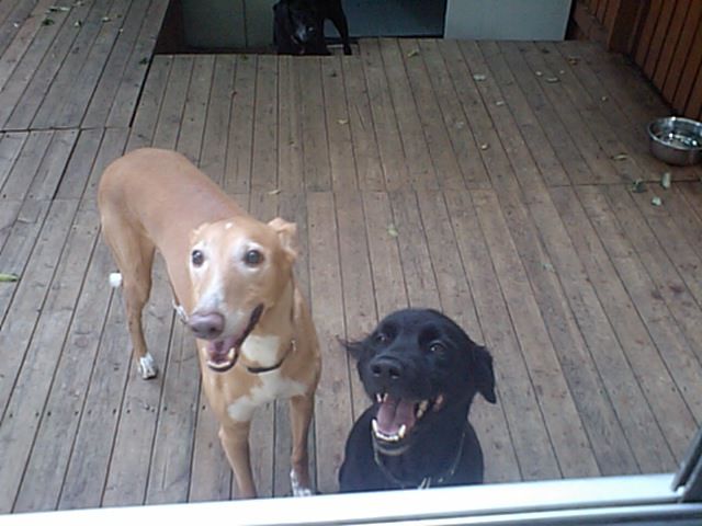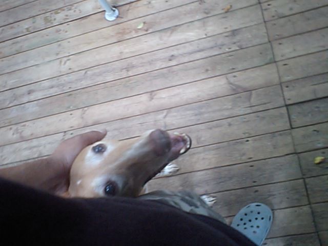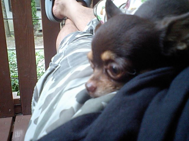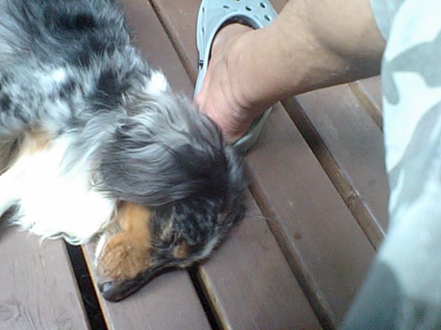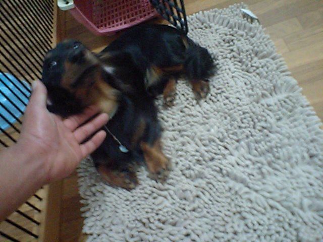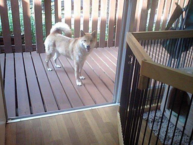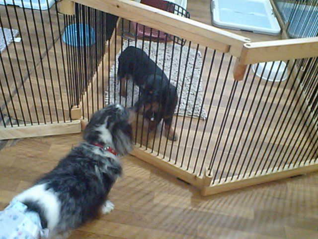 みんなそれぞれデッキに出たりして遊んでます。ダックスのシャロン君はサークルの中から店長に甘えて来ます。