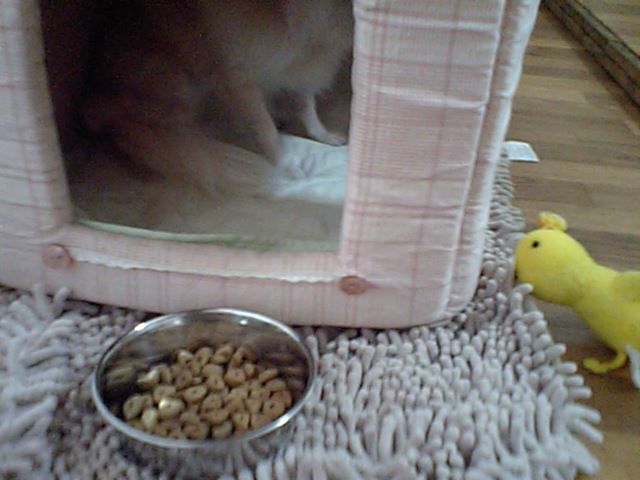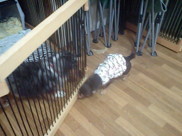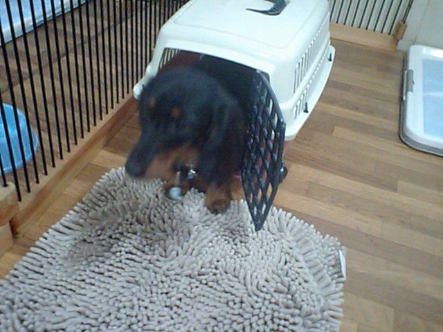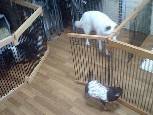 とりあえず自分のハウスに入ってましたが、しばらくしたら出てきました。サークル越しに他のワンコが近づくとまたハウスに入ってしまう。