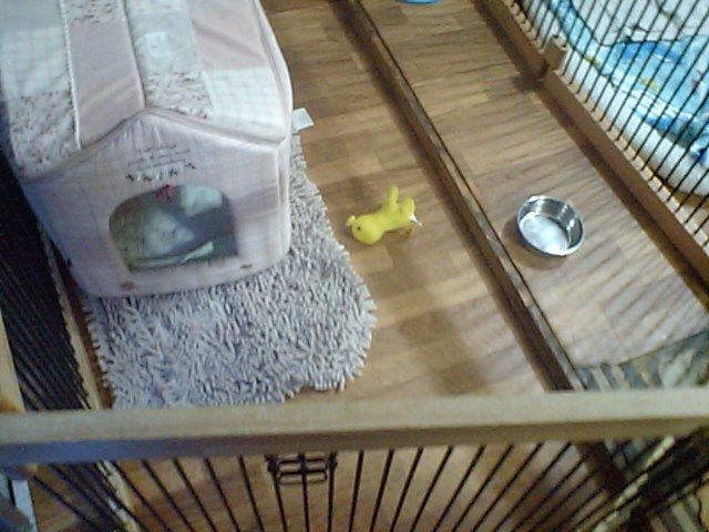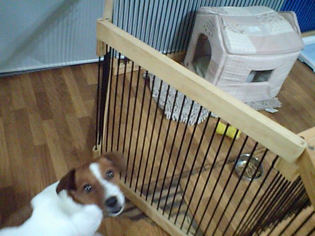 ジャックラッセルのジャジャちゃんが遊びたいらしいですが、近寄るとドリ君は籠もってしまってます。