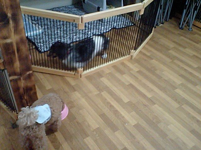 ポロン君は他のワンコ大好きとの事で、サークルの外で遊んでます。ただミックスのドラちゃんはあまり遊びたくない様子です。 シャロン君は他のワンコが苦手との事、サークルの中に居て貰ってます。店長には甘えて来て可愛いです。