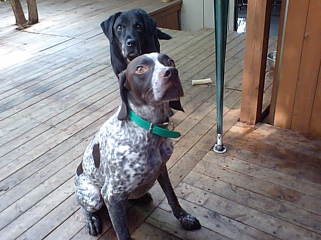 ジャーマン・ポインターのモス君が久々に遊びに来ました。 ボーダーのサエノスケ君に乗っかられて歓迎されてます。