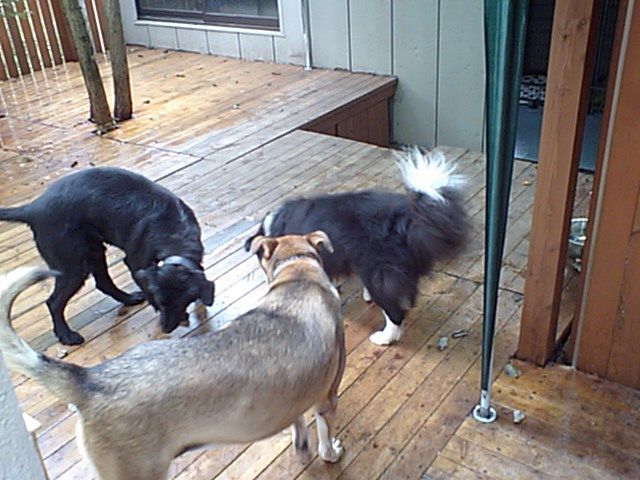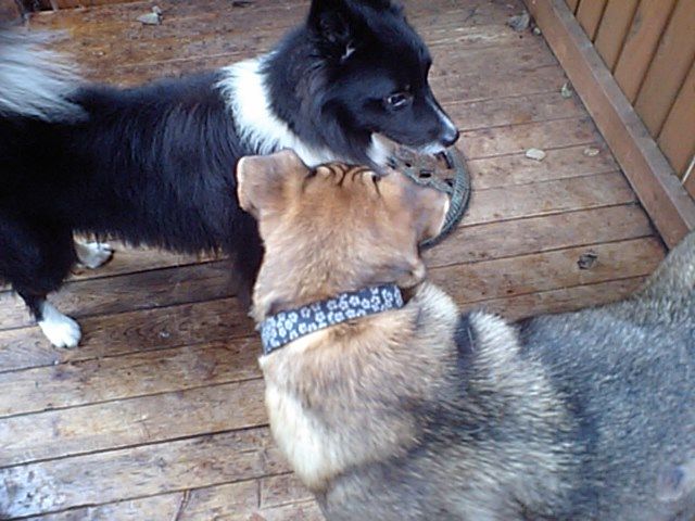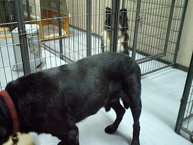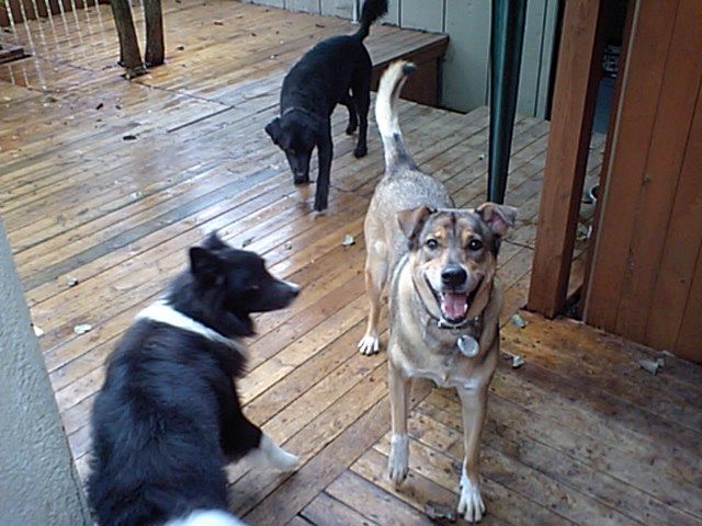 ミックスあられちゃんは大型犬エリアに移しました。ボーダーのサエノスケ君と仲良く遊んでます。