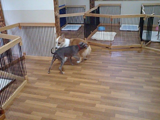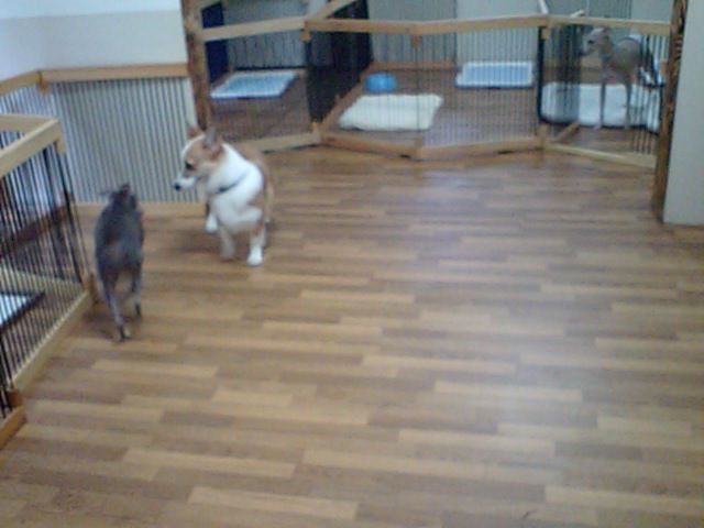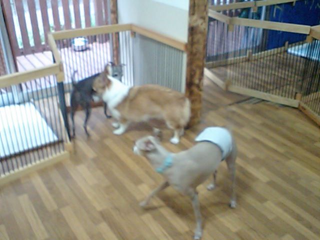 仲良く遊んでいたイタグレちゃんズがチェックアウトしてしまい、うなだれながら見送るコーギーのルーニー君です。