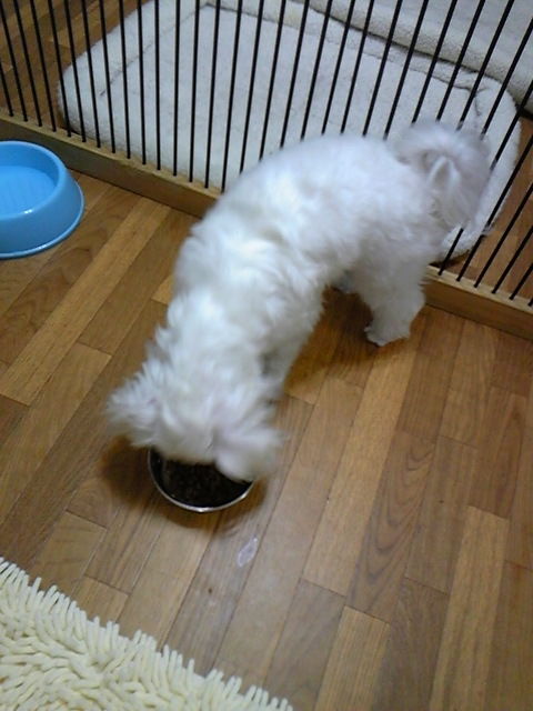 マルチーズのアラレちゃん、半分くらいしか食べませんでした。そのまま置いておきますね。初めてのお泊まりの緊張と今日の疲れが出ちゃったかな?