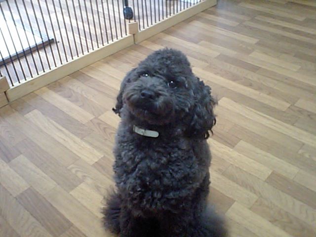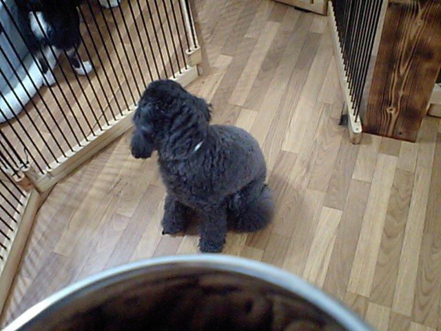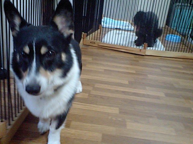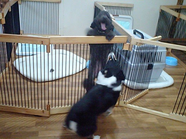 トイプーちゃんと遊びたいらしく追いかけますが、トイプーちゃんが逃げてしまいます。ストレスになるといけないので、サークルで分けてます。
