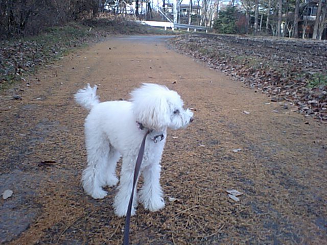 唐松の葉が降り積もって、道が金色になっています。その中をシナモン君は元気にお散歩してきました。
