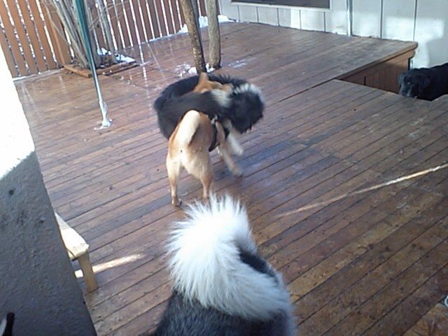 常連ボーダーのサエノスケ君がチェックインしました。ハスキー小太郎君とフラットのケイ君から大歓迎されてます。三つ巴で犬舎の中やデッキで暴れ回ってます。