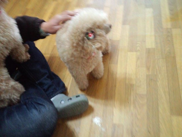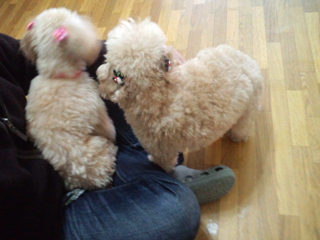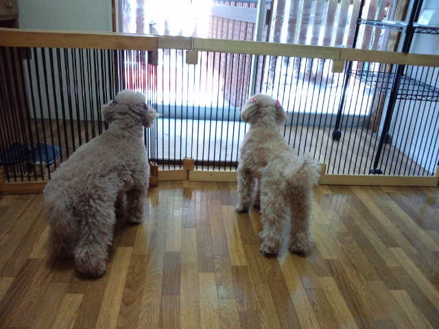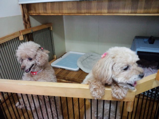 二匹は親子のトイプーちゃんズ、しばらくは外を眺めて寂しがってましたが、今は落ち着きました。 マコちゃんは店長にすぐに甘えて来てます。モモちゃんはまだ距離を置く状態です。でもすぐ慣れてくれる感じです。