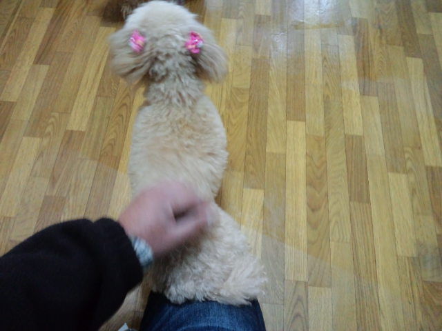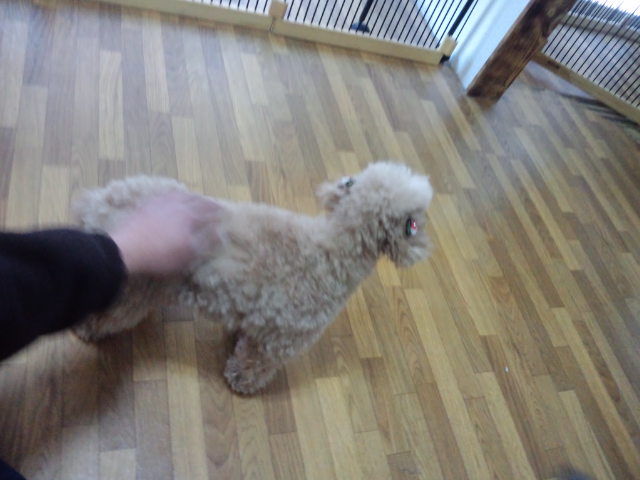 トイプーのモモちゃんも慣れてきました。最初は少し離れて撫でさせる様に、少しずつ距離を縮めて店長の膝に乗りたい素振りも。