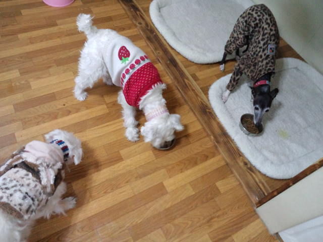 シュナウザーのウリちゃんとプクちゃん、イタグレのヨネちゃんは仲良く完食しました。
