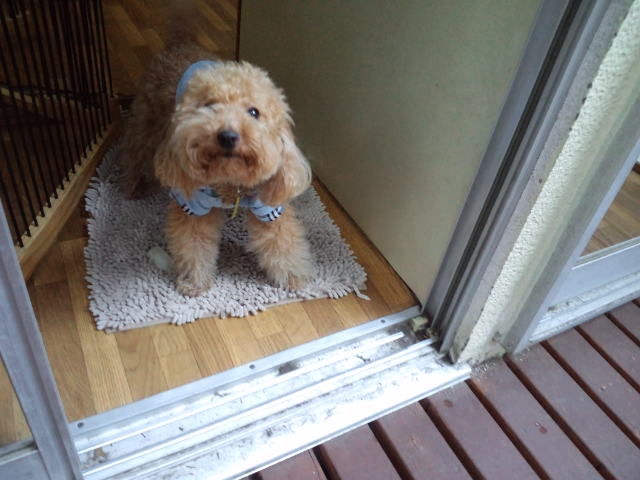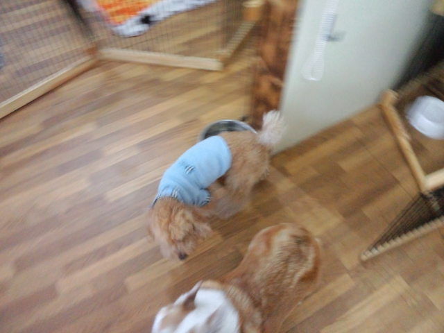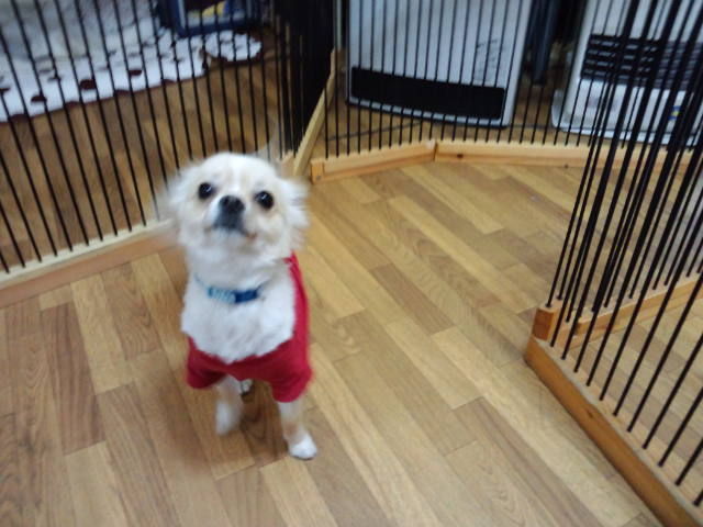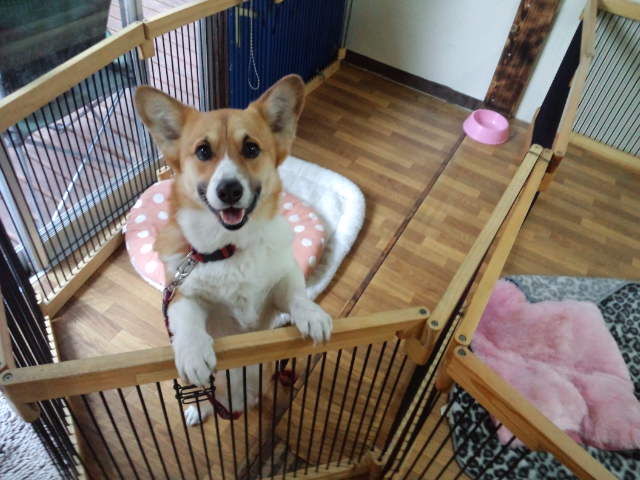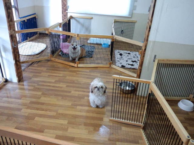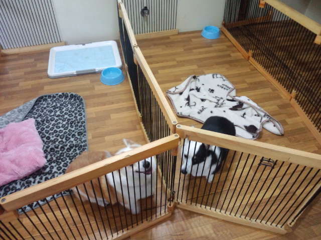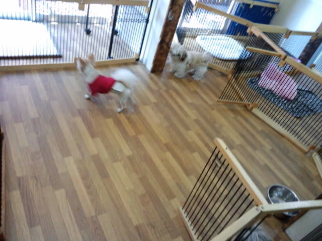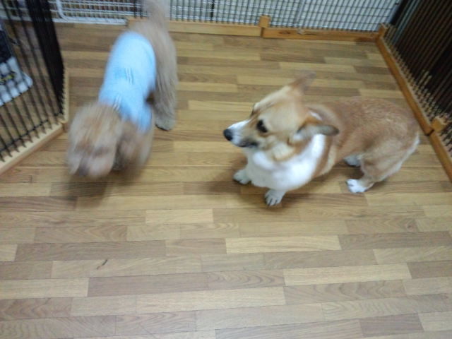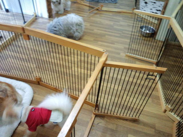 最初は寂しがってましたが、サークルから出したら他のわんこ達と遊び始めました。