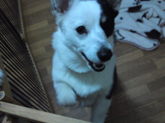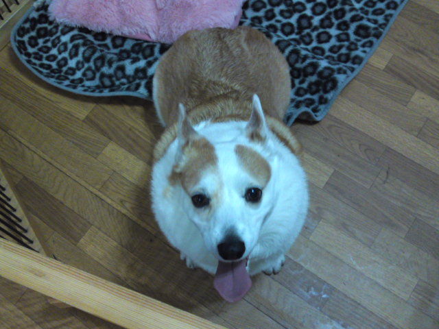 コーギーのナナちゃんは店長に構って構ってと騒いでいます。