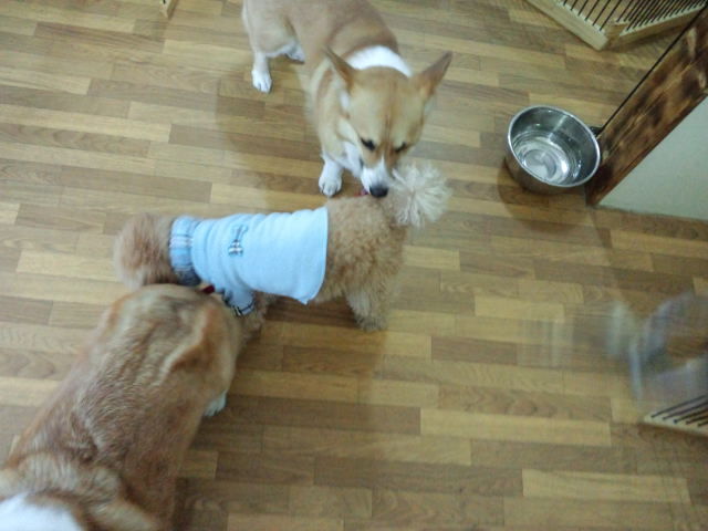 来るなりコーギー君と遊んでます。 ダディーの雰囲気にもなれたものですね。