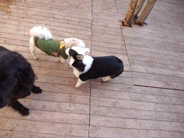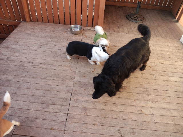 コーギーのフーちゃんは大型犬のデッキに出しました。たちまちみんなに囲まれて、挨拶しあって仲良くなりました。