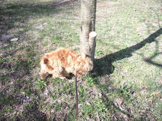 寒冷地の軽井沢でも花が咲き始め、ジロ君も花をバックに記念撮影です。