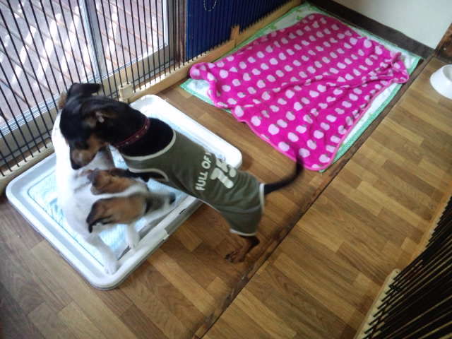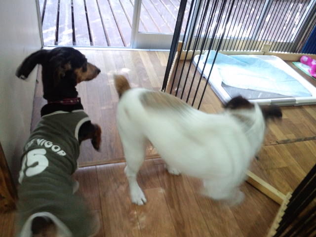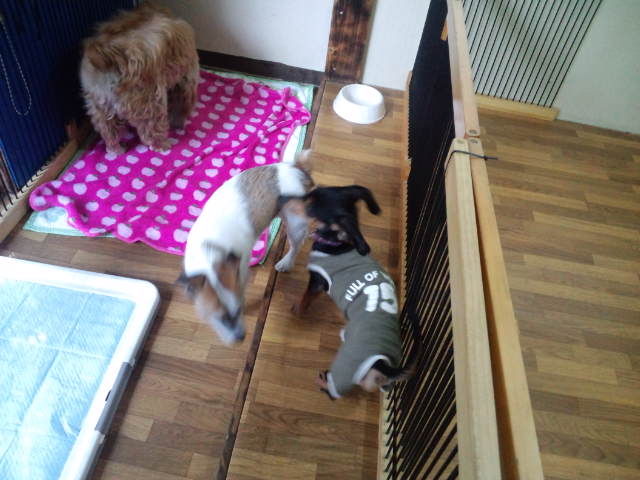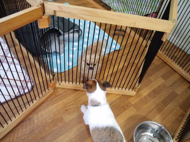 他のワンコ達とはサークル越しなら大丈夫みたいですが、ジャックラッセルのリキ君は苦手みたいです。