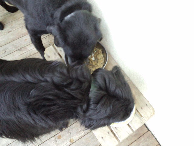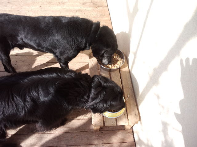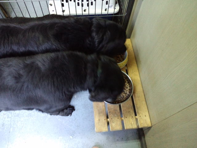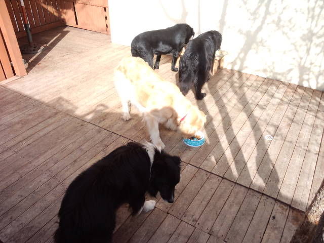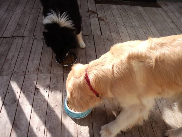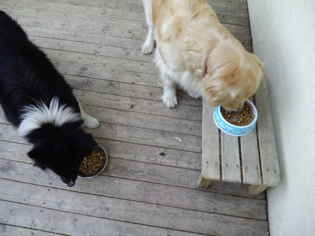 ゴールデンのマロンちゃんとボーダーのサエノスケ君、並んで仲良く完食しました。