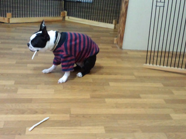 ボストンのナッツちゃん、あれから骨ガムを食べてご機嫌が直った様子です。