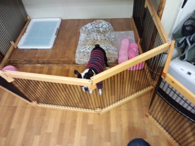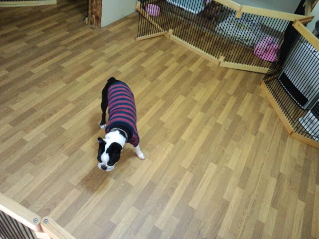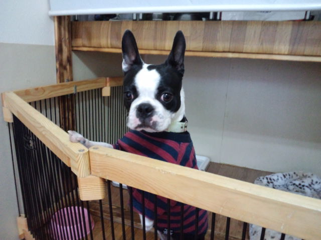 ボストン・テリアのナッツちゃんがチェックインしました。 すぐにサークルから出て来て店内をウロウロ。飼い主さんと離れてまだ少し寂しいみたいです。