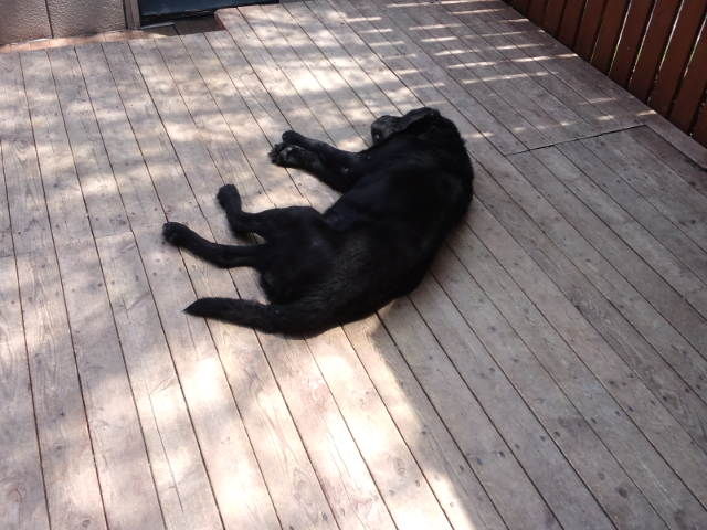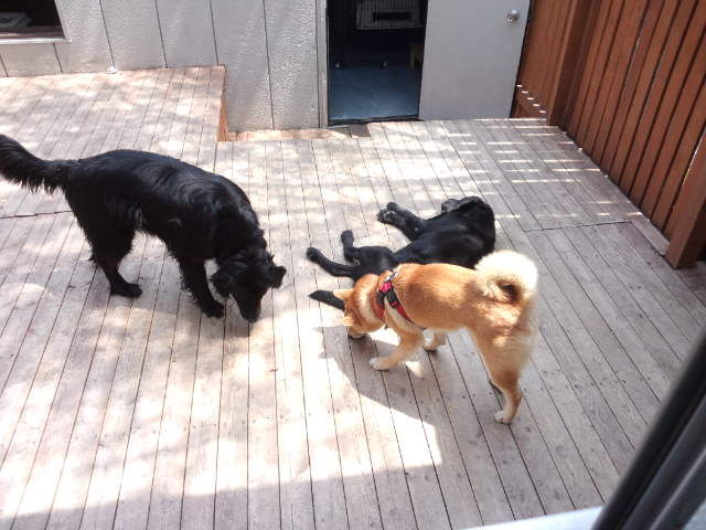 今日は天気の良い軽井沢。大型犬エリアでは、ブラッキー爺さんが気持ち良さそうにお昼寝してます。その周りでは柴のハチ君と大治郎が戯れてます。