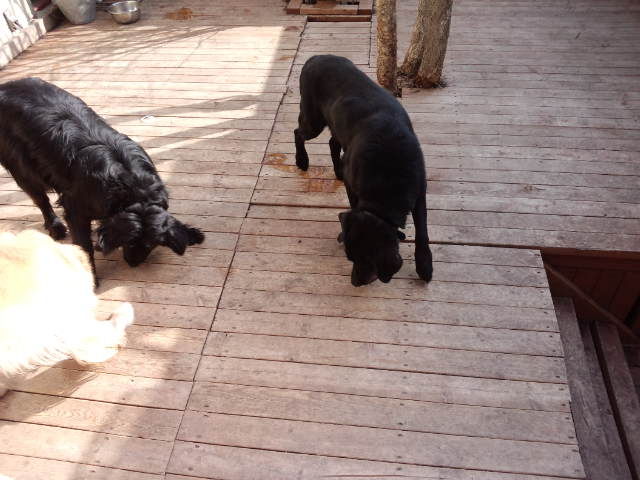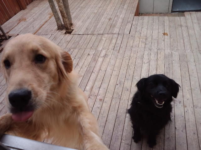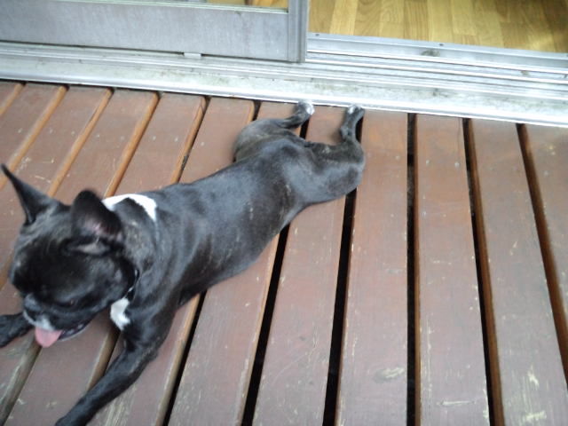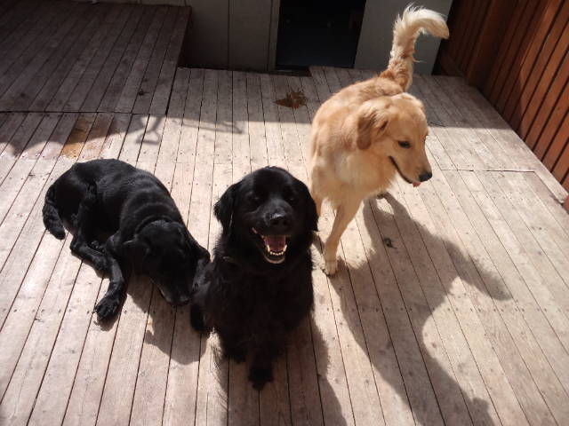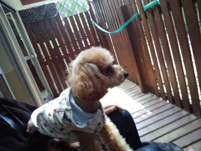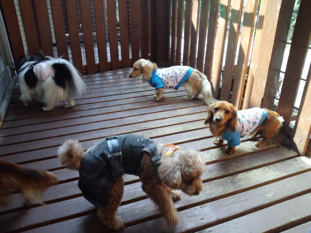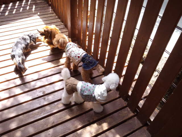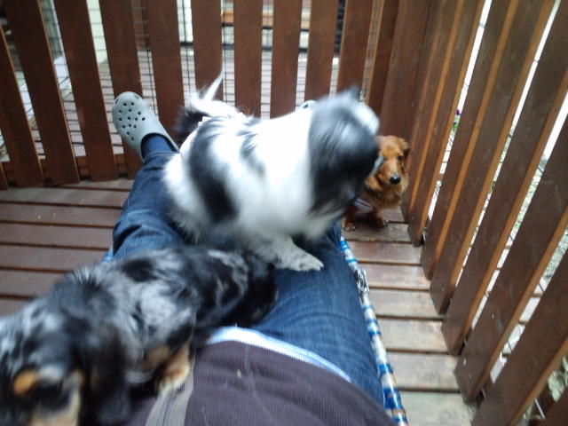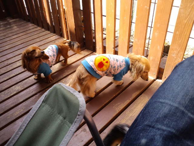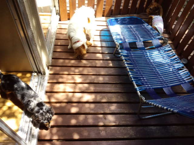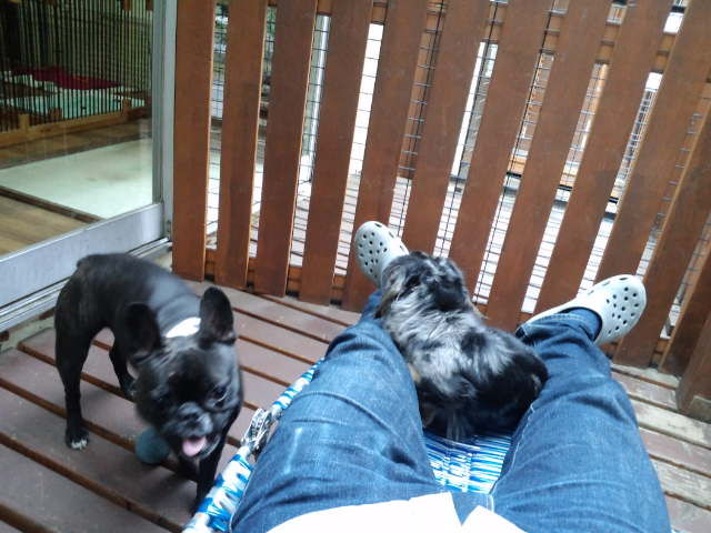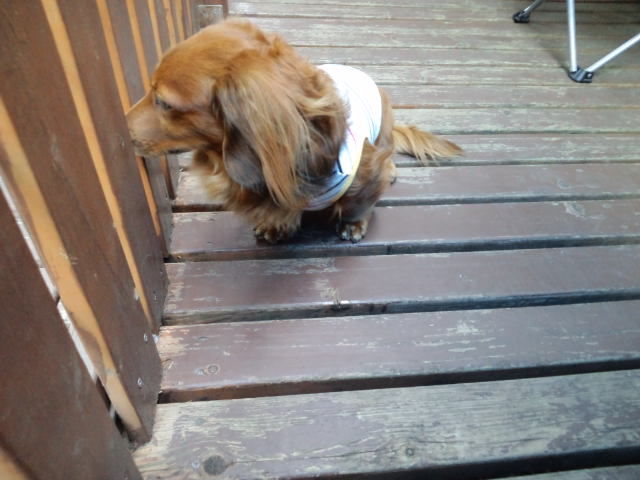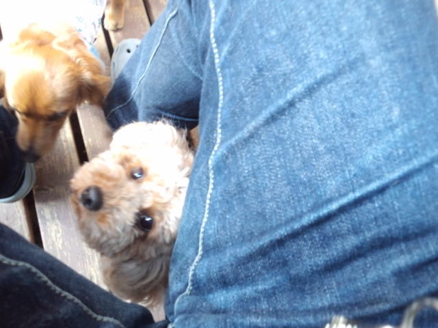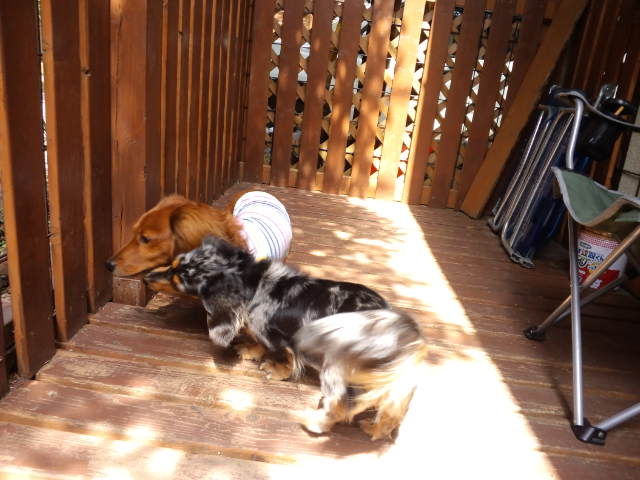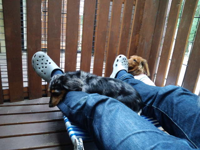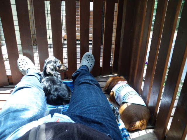 デッキで休んでますが、足元にはダックスのココアちゃんとオーシャン君。