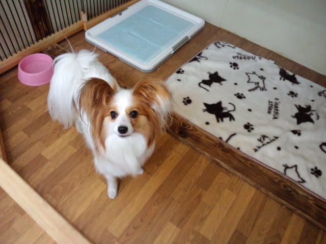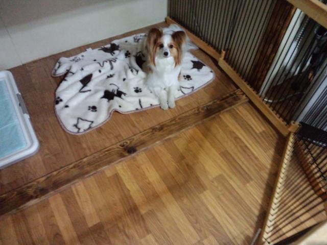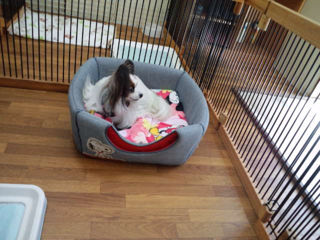 パピヨンのマリちゃんはサークルで休んでます。